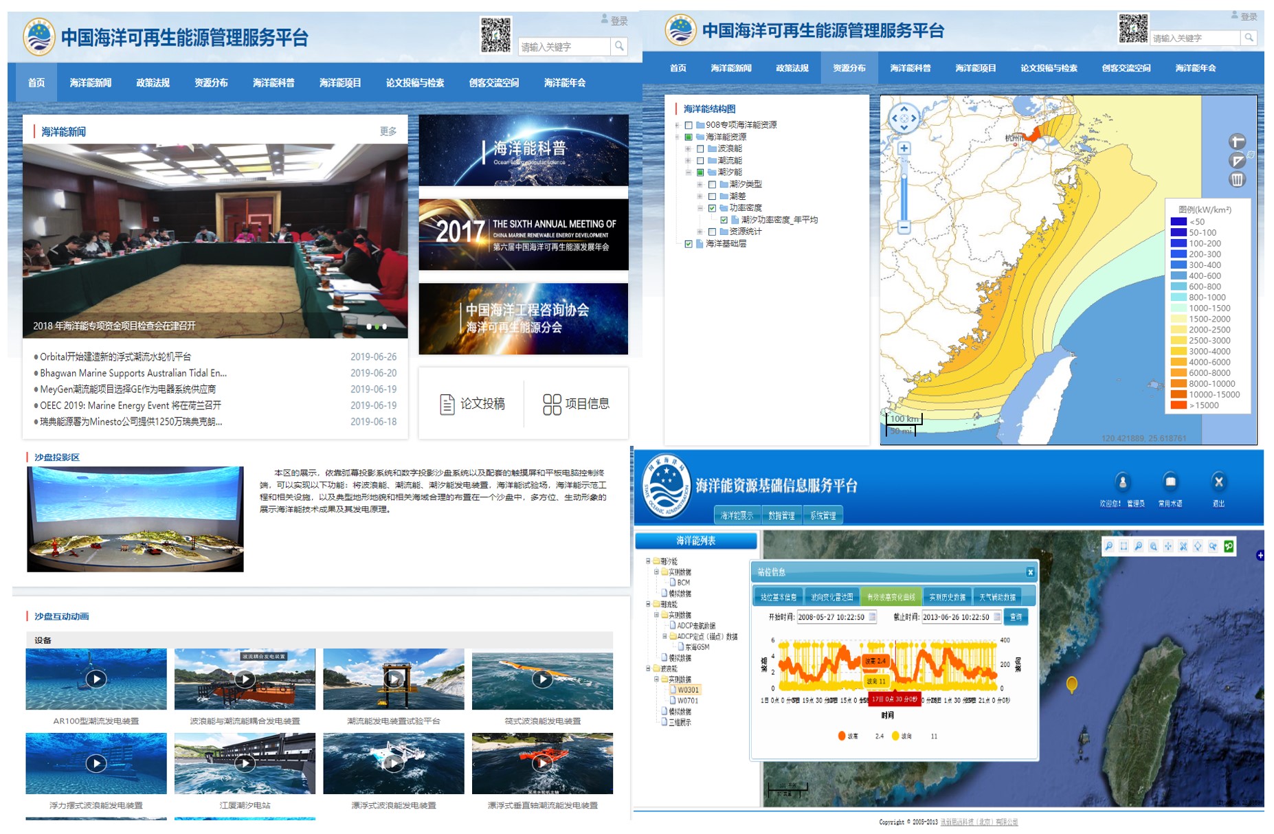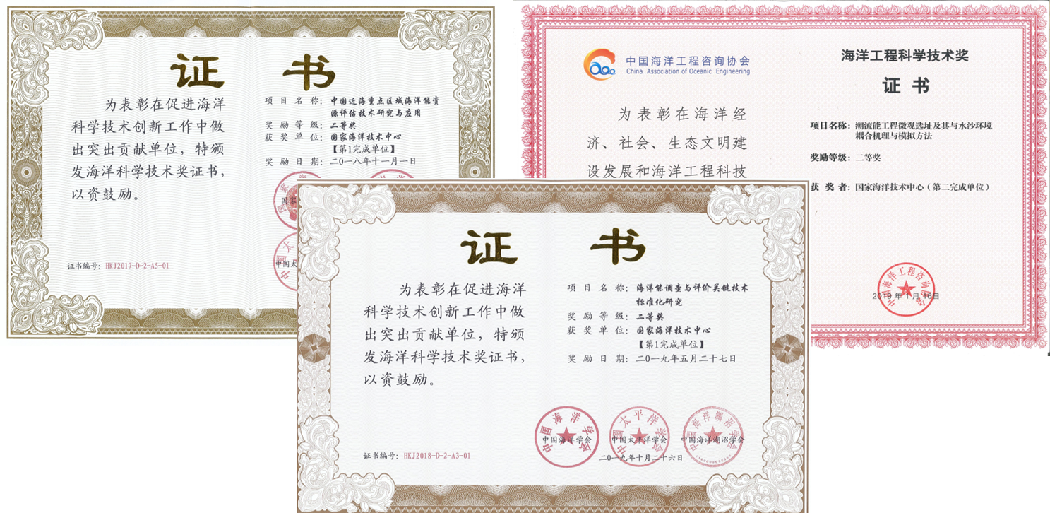 在此基礎上,國家海洋技術中心海洋能資源評估與區劃技術團隊采用國際先進方法建立了覆蓋整個中國近海的高分辨率海洋數值模型,并結合多個代表區域的潮位、海流、波浪等觀測數據,對我國近海潮汐能、潮流能、波浪能、溫差能、鹽差能和近海風能資源特性進行了評估分析,估算了我國近海各海洋能種的開發利用潛力,遴選了一批綜合開發條件優異的潛在站址,繪制了《中國近海海洋圖集——海洋可再生能源》、《中國海洋能近海重點區資源分布圖集》,出版發行了《中國近海海洋——海洋可再生能源》等專著十余部,相關成果為南方電網、長江三峽、中國海洋大學、中科院廣州能源所等數十家企業和科研院所的海洋能發電技術研發和示范工程提供了支撐。