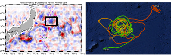 注:左圖中黑框內為中尺度渦位置(根據2018年5月16日衛星海表面異常數據反演的相對渦度和地轉流);右圖為浮標的漂移軌跡。