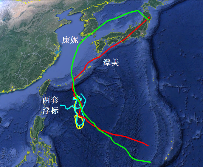 圖2兩套投棄式測波浮標漂移路徑和兩次超強臺風路徑