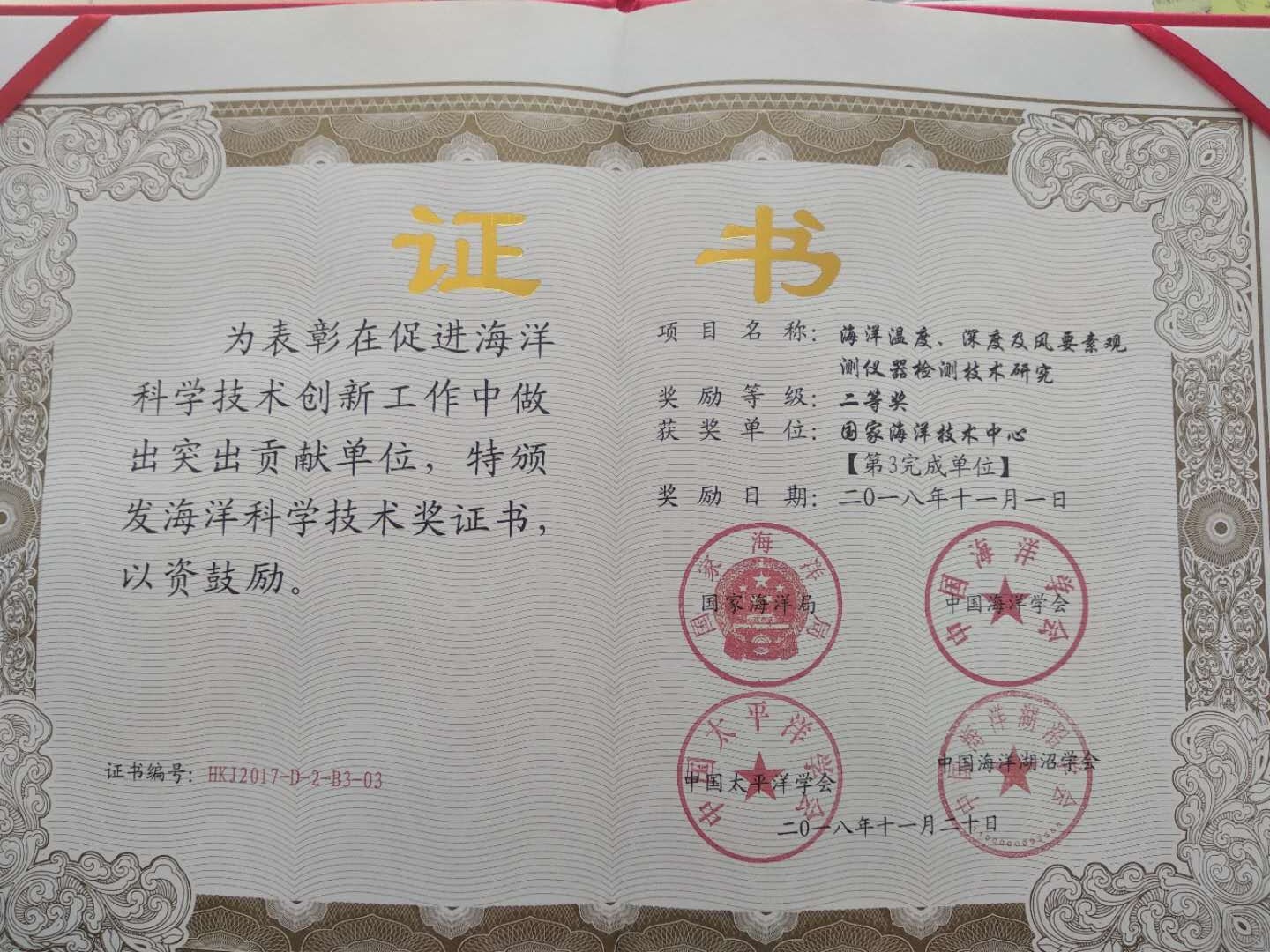 11月20日,中國(guó)海洋學(xué)會(huì)、中國(guó)太平洋學(xué)會(huì)聯(lián)合主辦的第九屆海洋強(qiáng)國(guó)戰(zhàn)略論壇暨2017年度海洋科學(xué)技術(shù)獎(jiǎng)?lì)C獎(jiǎng)儀式在廣西北海市舉行。在頒獎(jiǎng)儀式上,我中心參與的“海洋溫度、深度及風(fēng)要素觀測(cè)儀器檢測(cè)技術(shù)研究”項(xiàng)目獲得二等獎(jiǎng)。