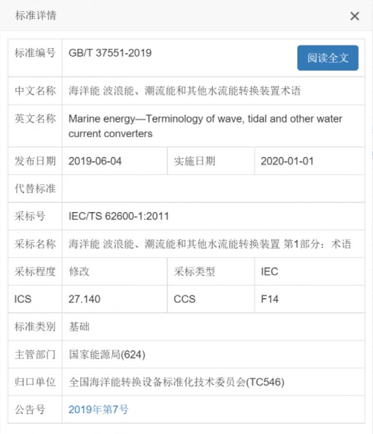 歷經(jīng)四年時間,多輪專家討論,二十九稿修改完善,國家標(biāo)準(zhǔn)GB/T 37551-2019《海洋能 波浪能、潮流能和其他水流能轉(zhuǎn)換裝置術(shù)語》于近日批準(zhǔn)發(fā)布,將在2020年1月1日頒布實施。該標(biāo)準(zhǔn)使用重新起草法修改采用國際標(biāo)準(zhǔn)IEC/TS 62600-1:2011《海洋能 波浪能、潮流能和其他水流能轉(zhuǎn)換裝置 第1部分:術(shù)語》,是海洋能源領(lǐng)域國際標(biāo)準(zhǔn)引進(jìn)來的第一個標(biāo)準(zhǔn),也是海洋能源領(lǐng)域國際標(biāo)準(zhǔn)轉(zhuǎn)化為國家標(biāo)準(zhǔn)的第一個成功案例。該標(biāo)準(zhǔn)由國家海洋技術(shù)中心主持編寫,參與起草單位有哈爾濱大電機(jī)研究所、中國科學(xué)院廣州能源研究所、哈爾濱工程大學(xué)等十家單位。
