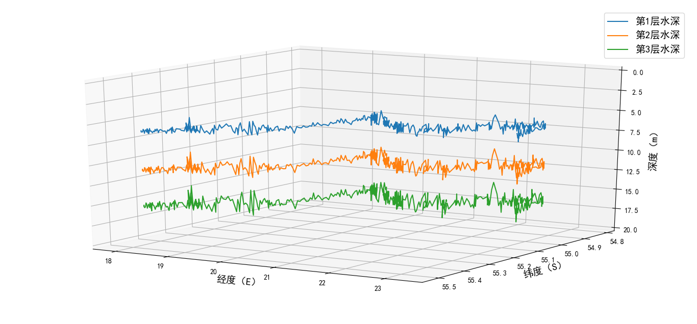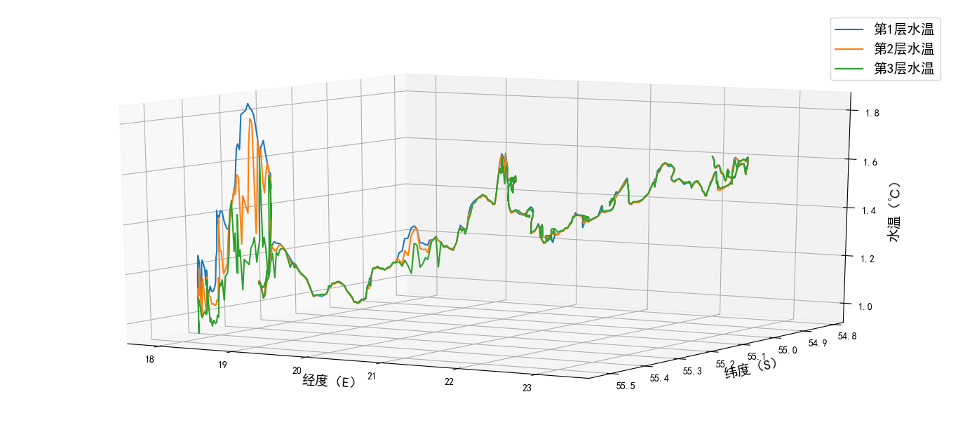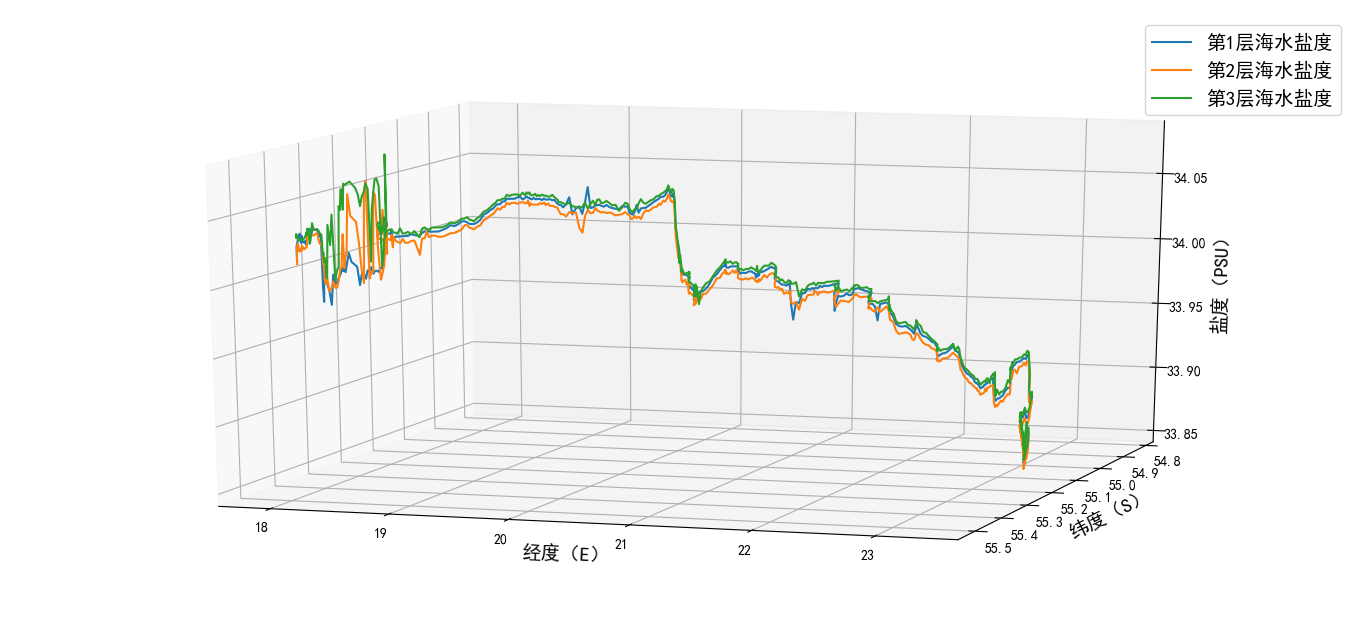 目前,浮標(biāo)已在位運(yùn)行近1個(gè)月,通過岸站接受到的數(shù)據(jù)繪制深度、溫度、鹽度隨漂流位置變化的三維曲線圖,可以看到,三臺(tái)儀器在纜上相對(duì)位置未發(fā)生改變,隨流深度變化趨勢(shì)一致;在布放初期的位置上,溫度和鹽度均有大幅波動(dòng),有較強(qiáng)的洋流,海水流動(dòng)交換極快。
