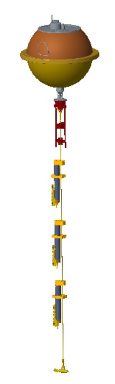 此次布放的感應(yīng)耦合式表面漂流浮標(biāo)主體結(jié)構(gòu)由浮標(biāo)中心負(fù)責(zé)設(shè)計(jì)與開發(fā),水下感應(yīng)耦合傳輸溫鹽深鏈由傳感器室研發(fā),整體系統(tǒng)的結(jié)構(gòu)如圖所示。水上浮體為直徑1米的球形,水下搭載的感應(yīng)耦合傳輸鏈長(zhǎng)20米,共加掛3層感應(yīng)耦合傳輸式溫鹽深儀。布放后實(shí)際工作水深的平均值分別為6.4米、11.2米、15.7米。