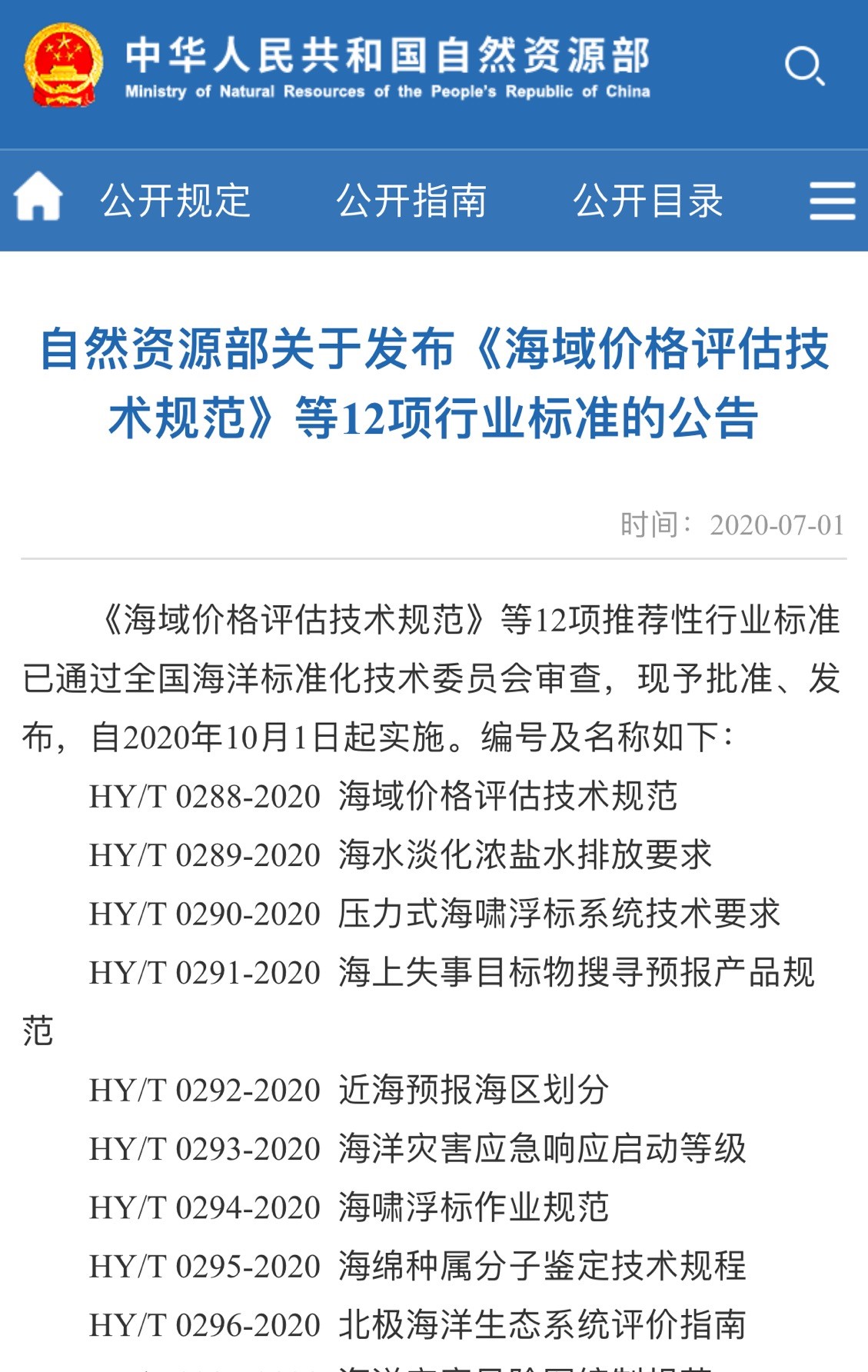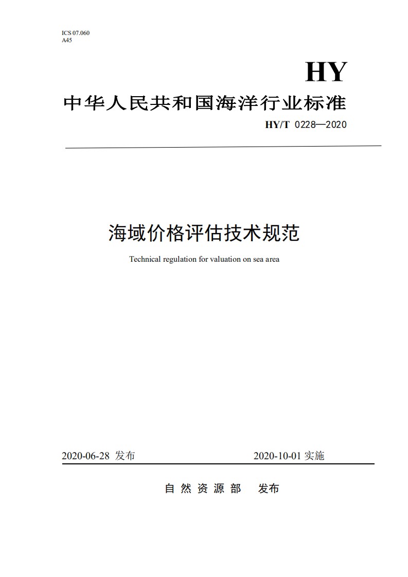 6月28日,《海域價(jià)格評估技術(shù)規(guī)范(HY/T 0288-2020)》推薦性行業(yè)標(biāo)準(zhǔn)獲自然資源部批準(zhǔn)發(fā)布,將于2020年10月1日起實(shí)施。《規(guī)范》在自然資源部海域海島管理司指導(dǎo)下,由國家海洋技術(shù)中心承擔(dān)起草。