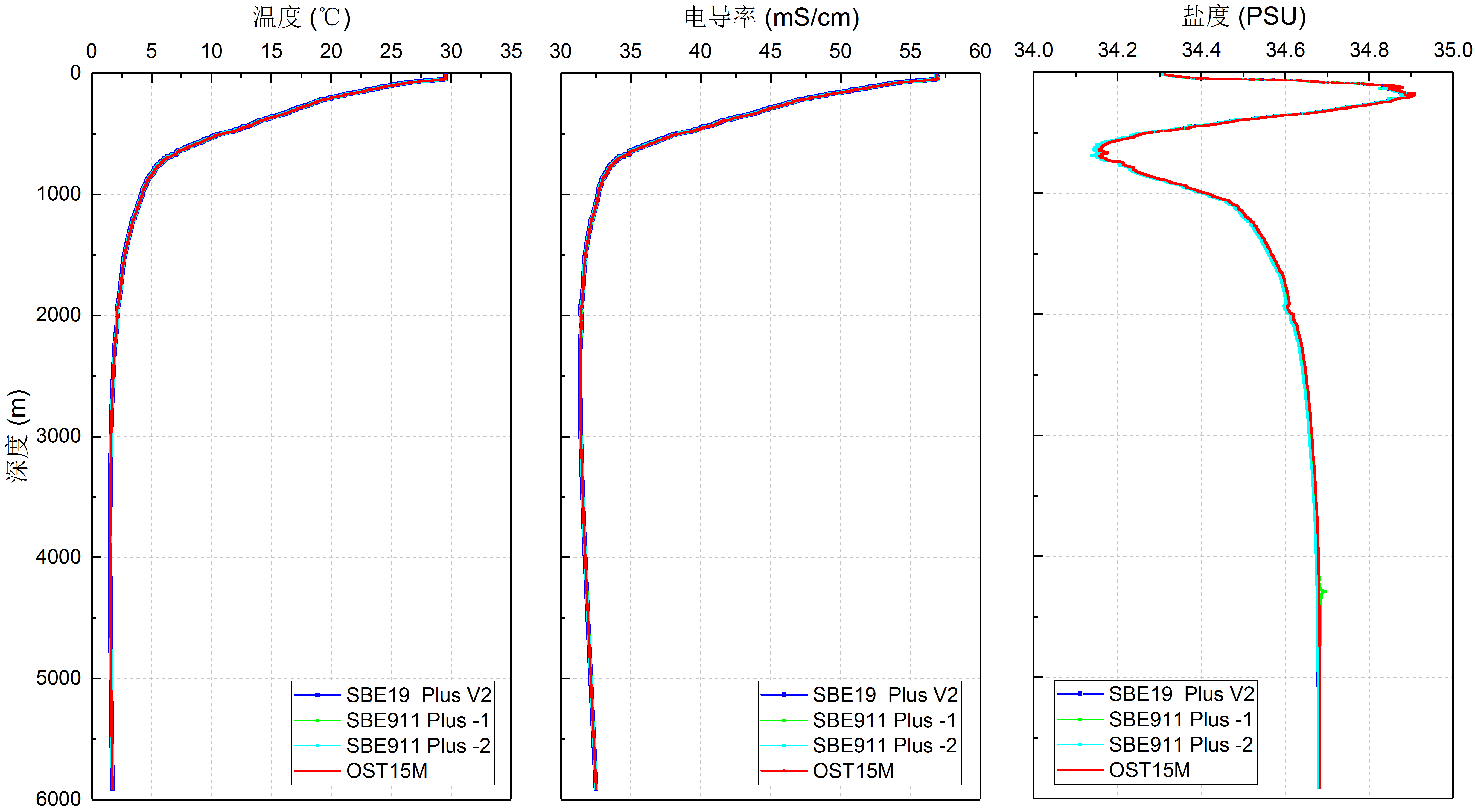 在本航次中,“OST15M型船載高精度自容式溫鹽深測量儀”完成了與美國SBE911 PLUS CTD、SBE19 PLUS V2 CTD的多剖面同步比測試驗,并進行了同步定深采水試驗,采水成功率100%。試驗最大下放深度5915米,最大采水深度4800米,獲取了大量西北太平洋深海溫鹽剖面數(shù)據(jù)以及超過500升的深海水樣。經(jīng)過與美國SBE911 PLUS CTD、SBE19 PLUS V2 CTD數(shù)據(jù)對比,國產(chǎn)儀器在總有效數(shù)據(jù)量占比、剖面數(shù)據(jù)動態(tài)跟蹤、數(shù)據(jù)一致性、相關性等方面均達到國外同類產(chǎn)品的水平。