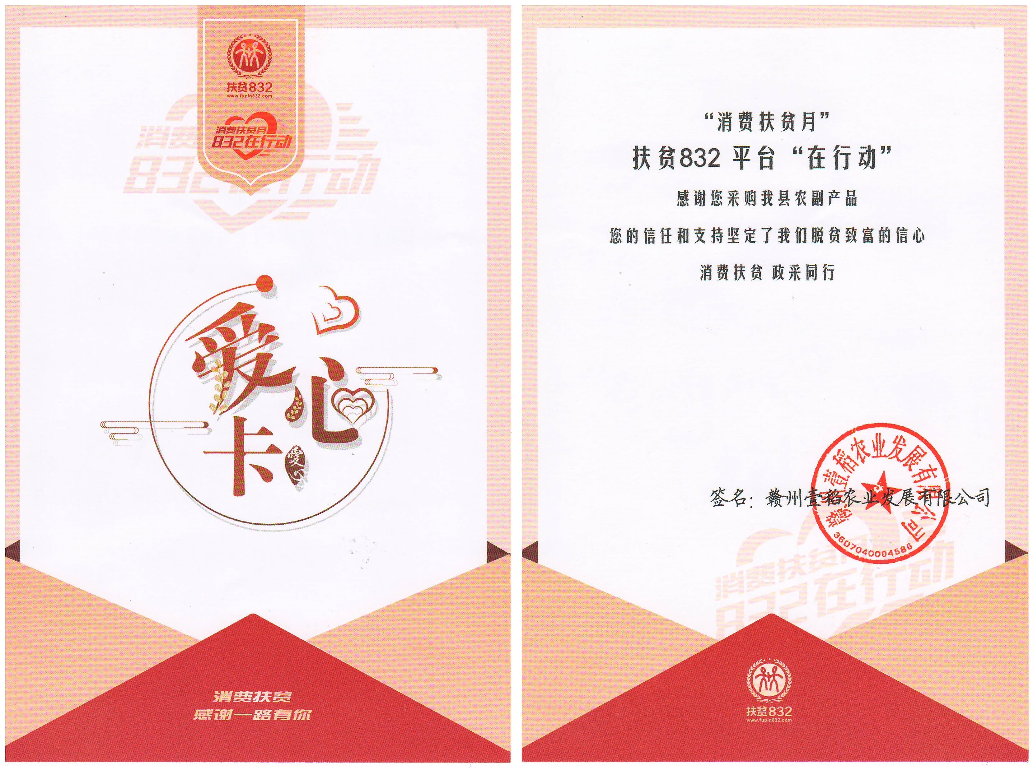 自然資源部定點貧困縣的農副產品代銷公司多次對中心“以買代幫”的助力方式表示衷心感謝,贛州壹稻農業(yè)發(fā)展有限公司還特意寄來了表達謝意的愛心卡。