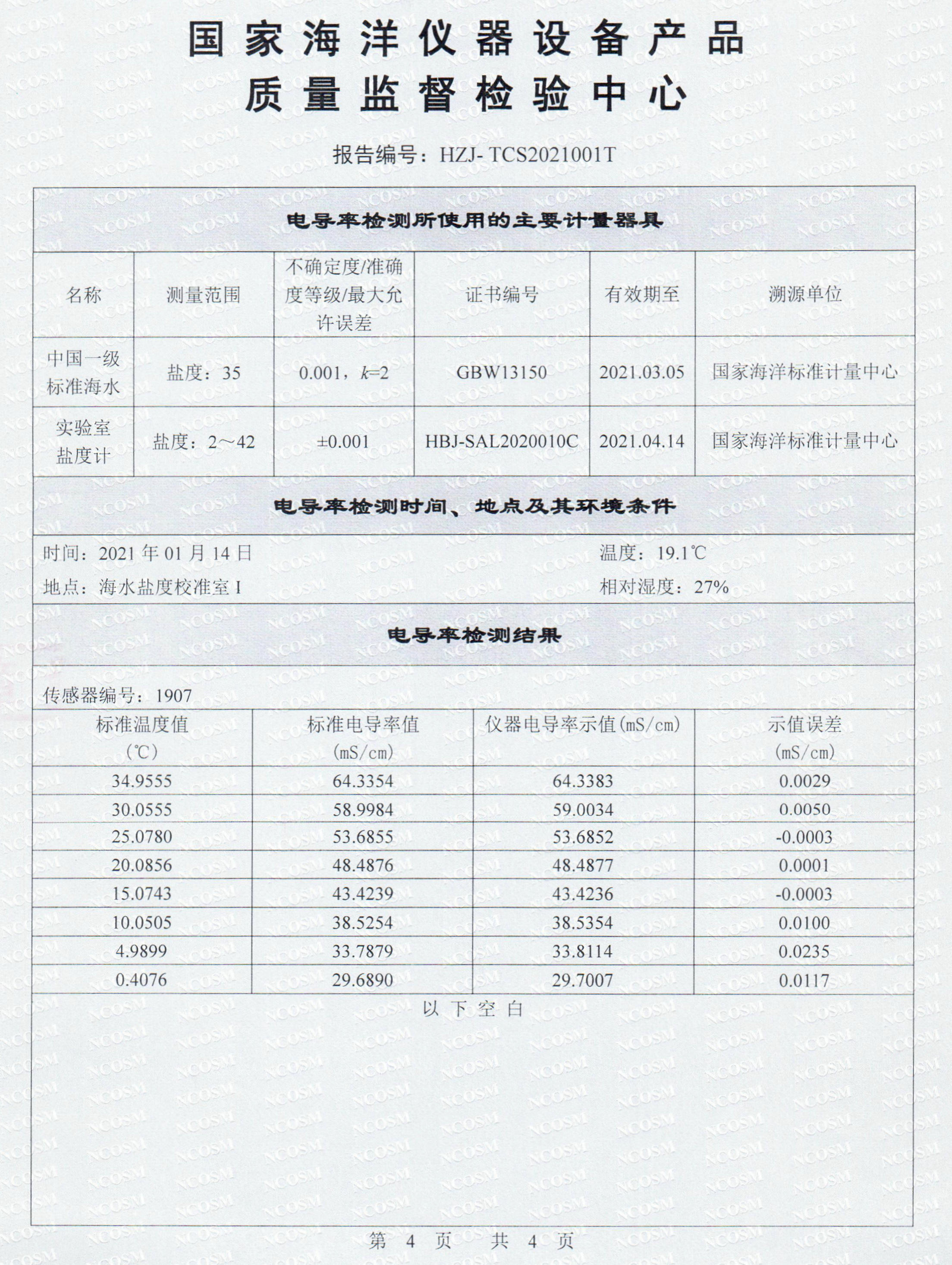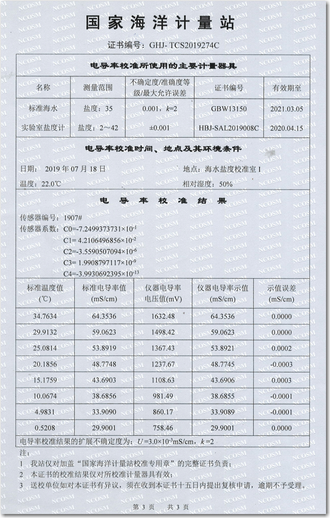 回收后,參試設(shè)備OST36M抗污染CTD完成外觀簡(jiǎn)單清洗,在國(guó)家海洋標(biāo)準(zhǔn)計(jì)量中心進(jìn)行了復(fù)測(cè),結(jié)果顯示,其電導(dǎo)率最大漂移為0.0235mS/cm,符合課題任務(wù)書、海試大綱中關(guān)于抗污染能力的考核指標(biāo)要求。