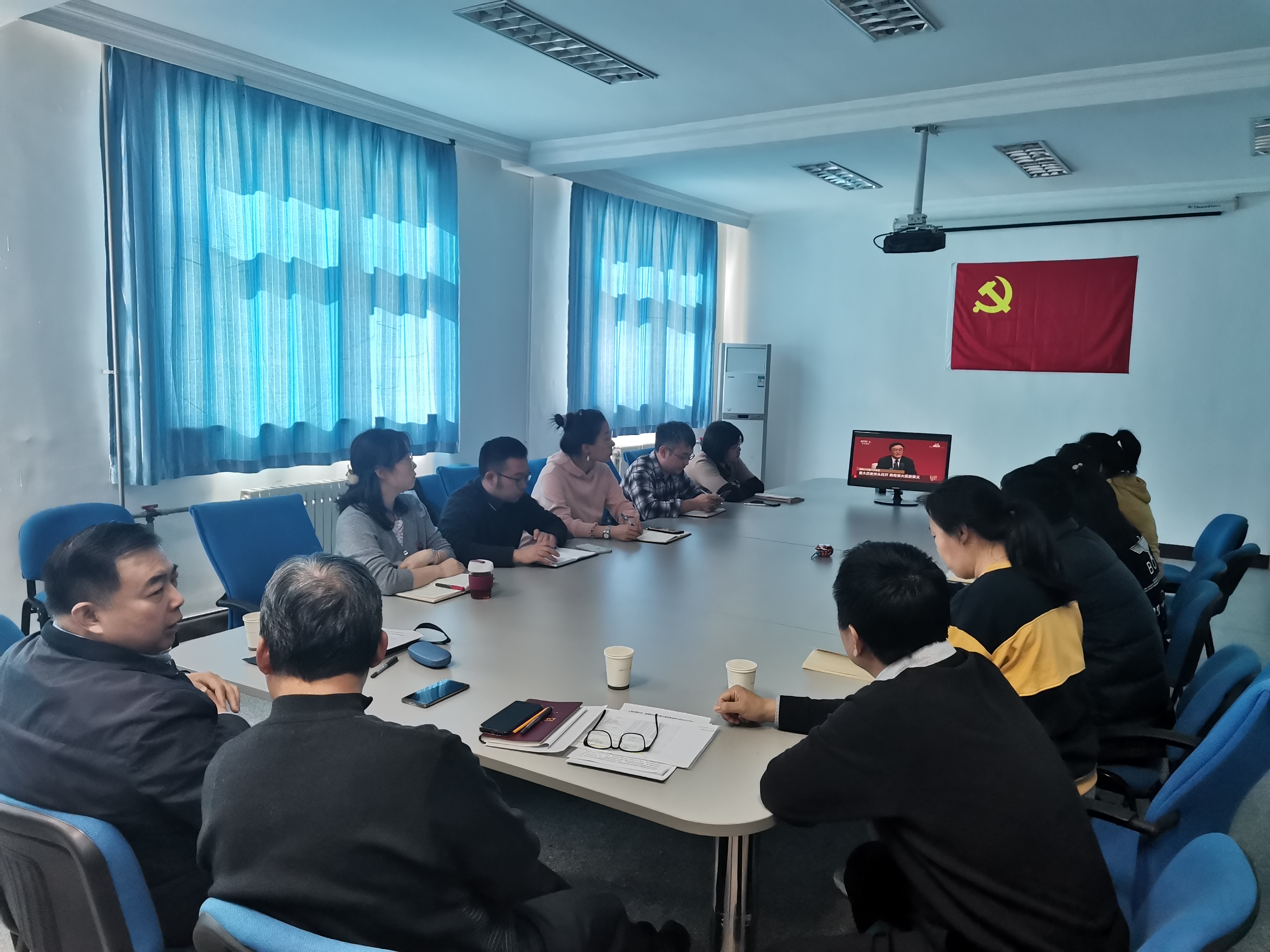 2021年11月12日上午,中心黨委委員副主任隋軍同志在黃河道院區315會議室與海保部黨支部的黨員同志一起集中收看黨的十九屆六中全會精神新聞發布會,認真聆聽專家學者解讀會議精神。