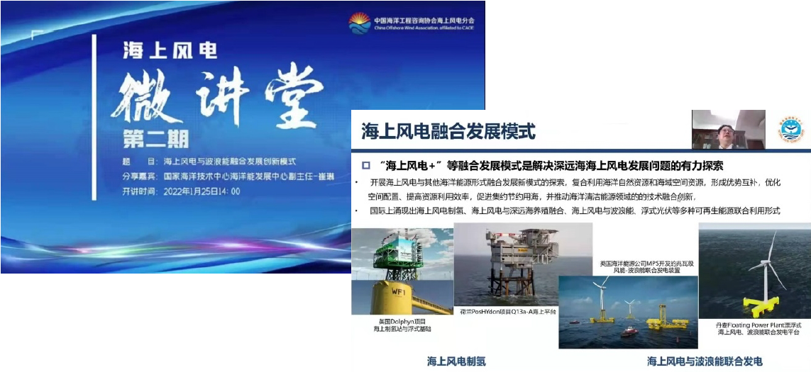 1 月25 日,海洋能發展中心崔琳副主任應中國海洋工程咨詢協會海上風電分會的邀請,在線參加了海上風電分會主辦的“海上風電微講堂”系列公益課堂。作為該系列活動第二期的主講人,他以《海上風電與波浪能融合發展創新模式》為題向國內海上風電及海洋能領域的從業人員和專家學者介紹了海上風電與波浪能融合發展中存在的問題、需求與挑戰。