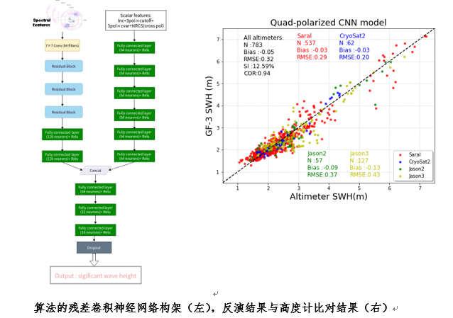 近日,中心航空部王賀副研究員作為第一作者(通訊作者),聯合國內多家海洋科研單位人員,利用人工智能技術,構建了基于殘差網絡的全極化SAR有效波高深度學習反演模型,在SAR海浪遙感方面取得重要進展。相關成果近日發表在國際遙感權威期刊Remote Sensing of Environment(影響因子10.164,中科院一區)。
