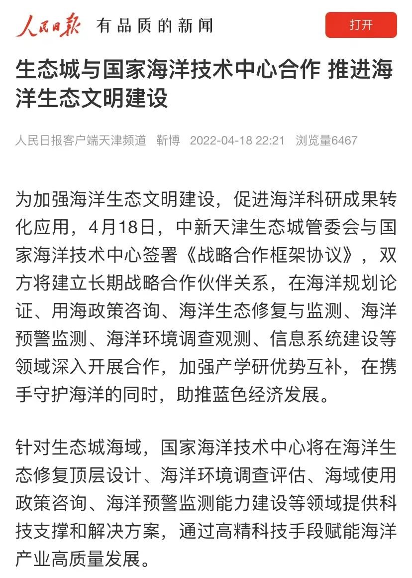 近日,人民日報客戶端刊發《生態城與國家海洋技術中心合作 推進海洋生態文明建設》文章,詳細介紹生態城與國家海洋技術中新合作,共同推進海洋生態文明建設,助推藍色經濟發展的內容。
