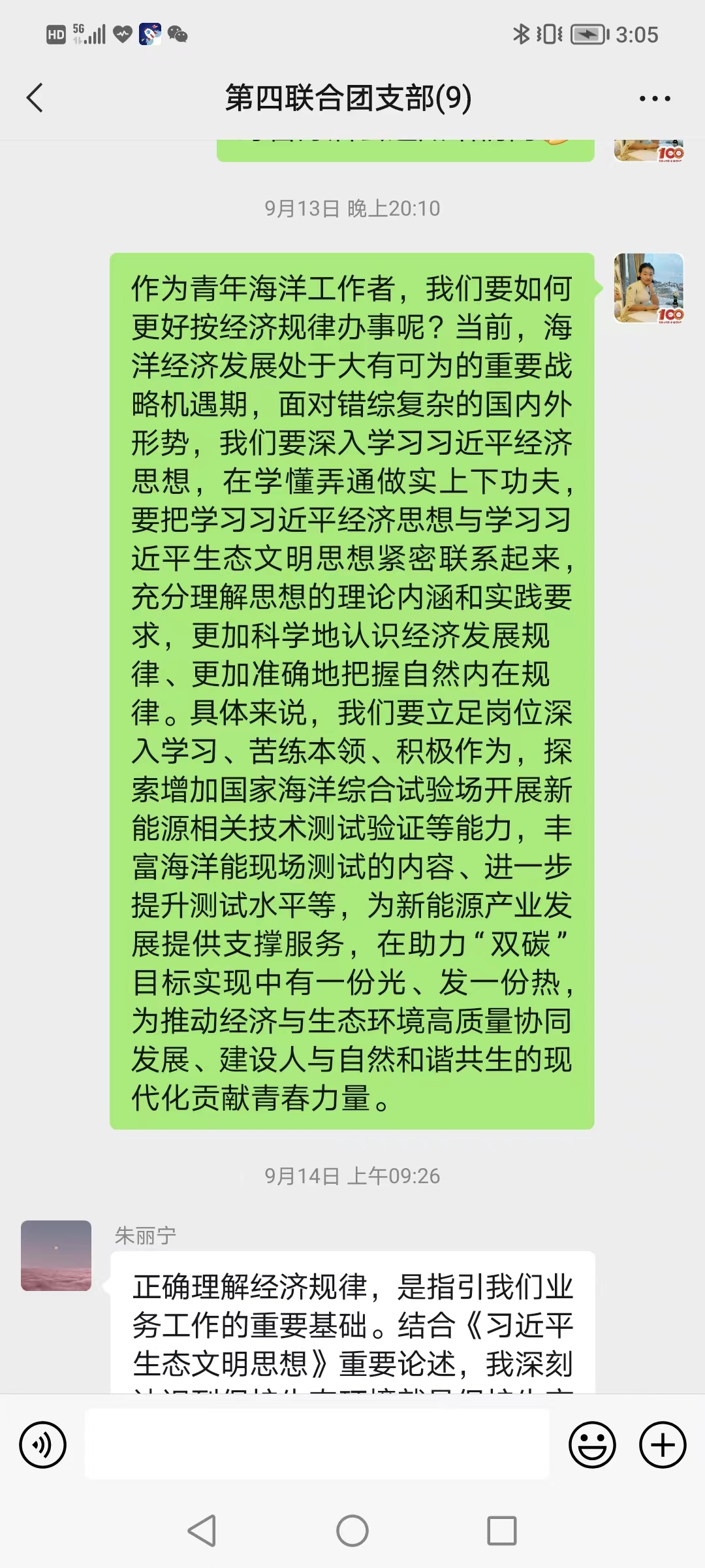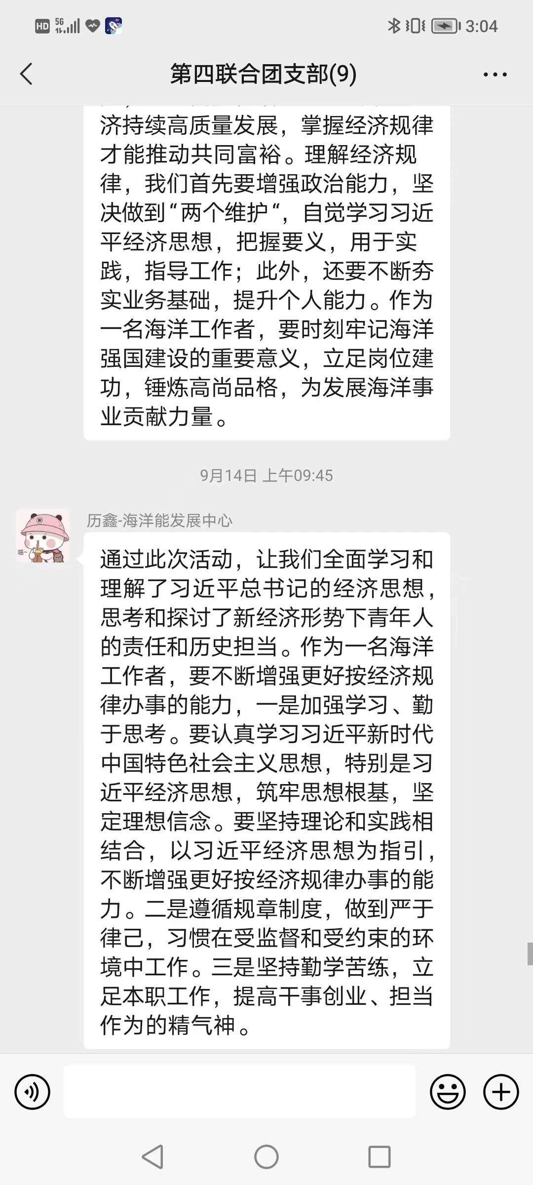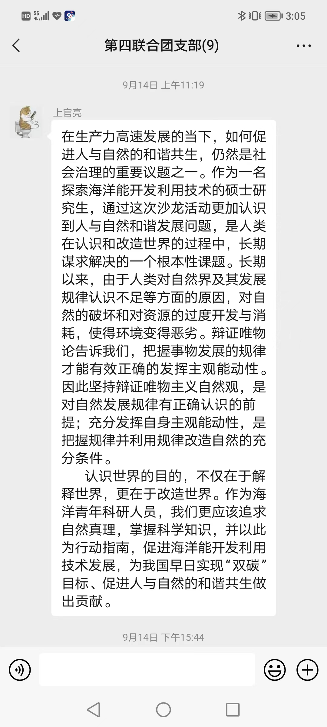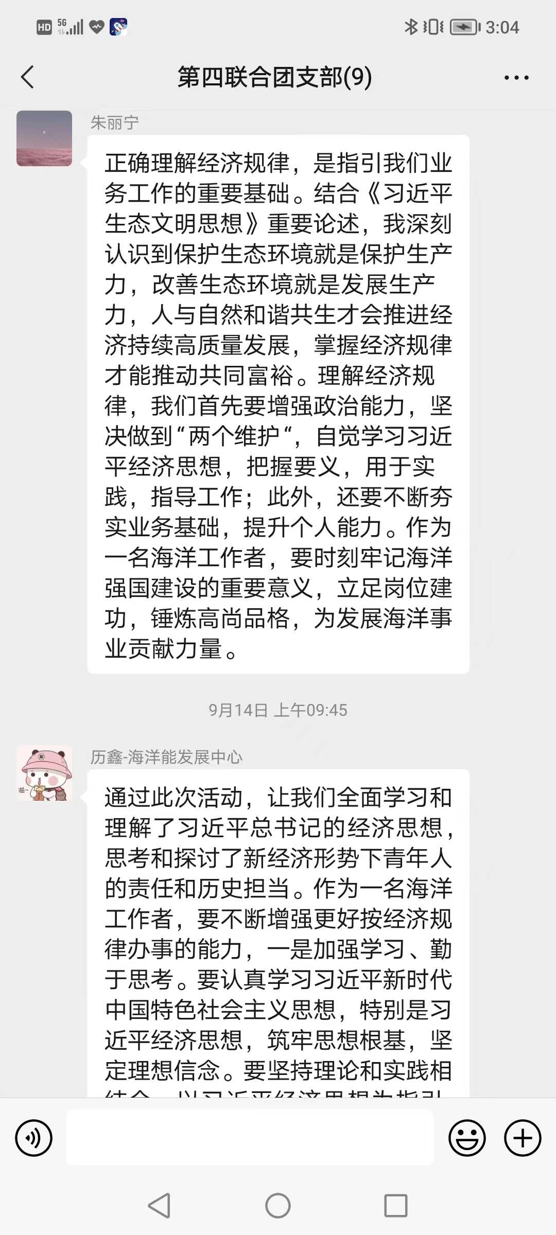 通過參加本次專題活動(dòng),支部團(tuán)員紛紛表示,作為新時(shí)代的海洋青年,既要在書本上下功夫,深入學(xué)習(xí)習(xí)近平新時(shí)代中國(guó)特色社會(huì)主義思想的理論內(nèi)涵和實(shí)踐要求,又要在工作中下功夫,更加科學(xué)認(rèn)識(shí)經(jīng)濟(jì)發(fā)展規(guī)律、更加準(zhǔn)確把握自然內(nèi)在規(guī)律,苦練本領(lǐng)、積極作為,為推動(dòng)經(jīng)濟(jì)與生態(tài)環(huán)境高質(zhì)量協(xié)同發(fā)展貢獻(xiàn)青春力量。(第四聯(lián)合團(tuán)支部 蘆穎)