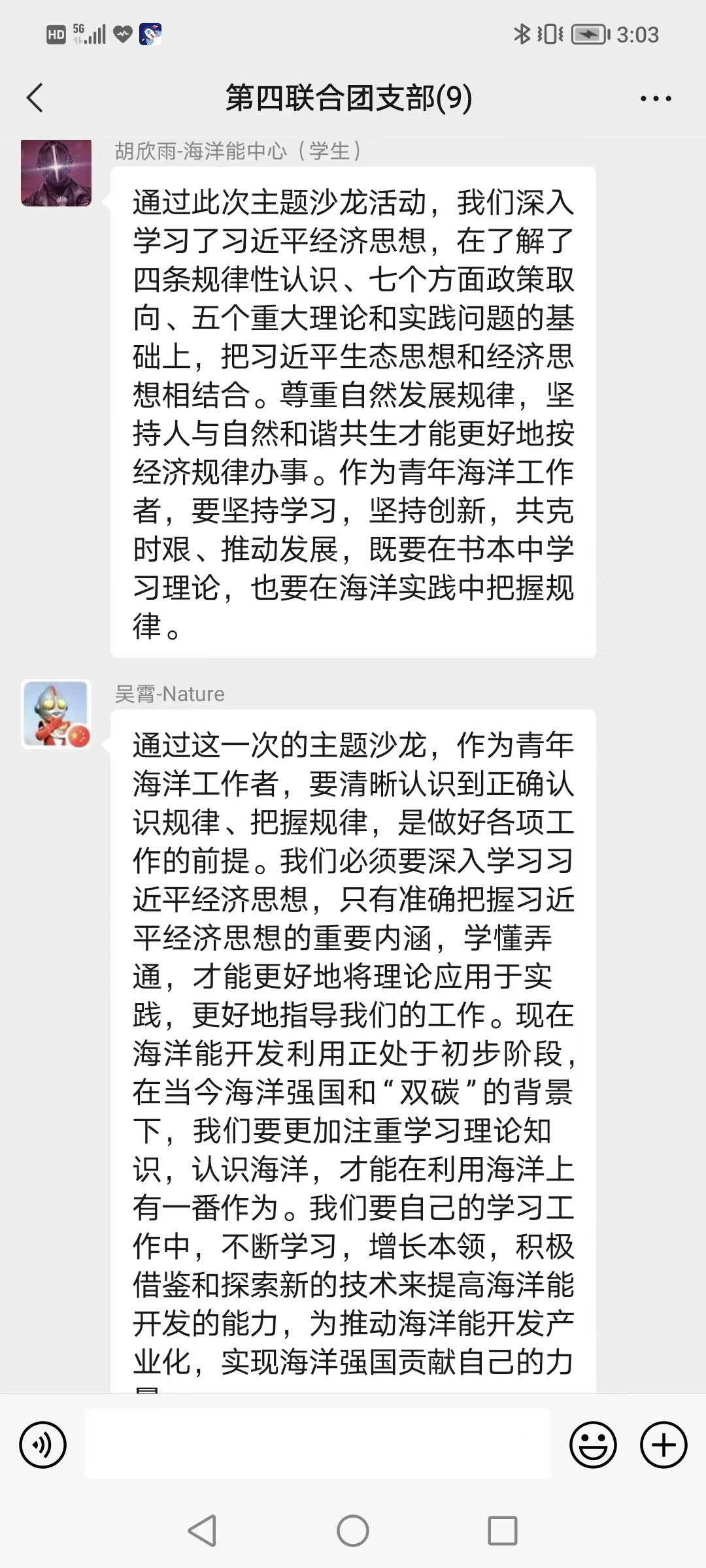 兩期沙龍分別請(qǐng)到“更好按經(jīng)濟(jì)規(guī)律辦事,自然資源青年怎么辦”——我的學(xué)習(xí)故事征文比賽政策建議類和理論性文章類作品的獲獎(jiǎng)作者進(jìn)行精彩的主題分享。團(tuán)員青年在收看時(shí)積極在團(tuán)支部微信群中互動(dòng),活動(dòng)結(jié)束后與大家分享學(xué)習(xí)心得,結(jié)合自身業(yè)務(wù)科研工作交流感悟和體會(huì)。