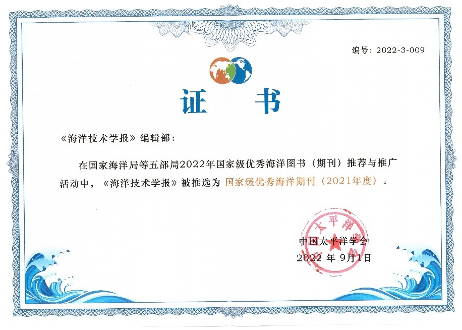 該推選活動是根據國家海洋局等五部局“全民海洋意識宣傳教育和文化建設”的指導意見,由中國太平洋學會發起,旨在從眾多的海洋圖書(期刊)中,把最精華的部分推薦出來,為廣大讀者推薦最有價值的海洋讀物,提高優秀海洋圖書(期刊)的普及率。《海洋技術學報》獲此殊榮,是肯定、是鼓勵、更是激勵,《海洋技術學報》編輯部將更加努力地做好編輯出版工作,為海洋技術的發展、海洋意識的普及做出貢獻。(戰規室 薛彩霞)