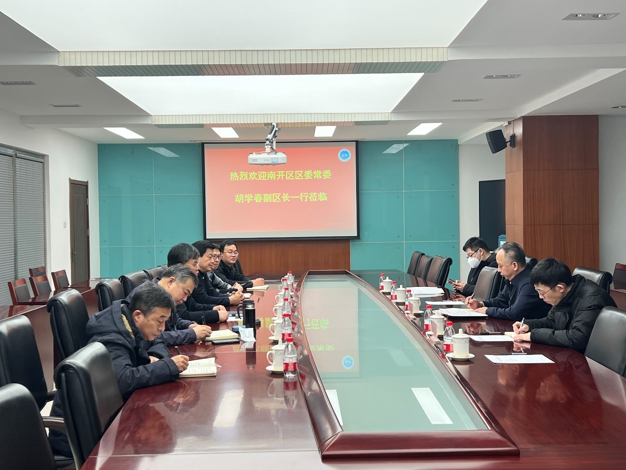 2023年2月3日上午, 天津市南開區區委常委、副區長胡學春一行到中心調研,中心領導彭偉主任、陳武軍書記、隋軍副主任以及辦公室、業務處、物保部部門負責人參加了座談。