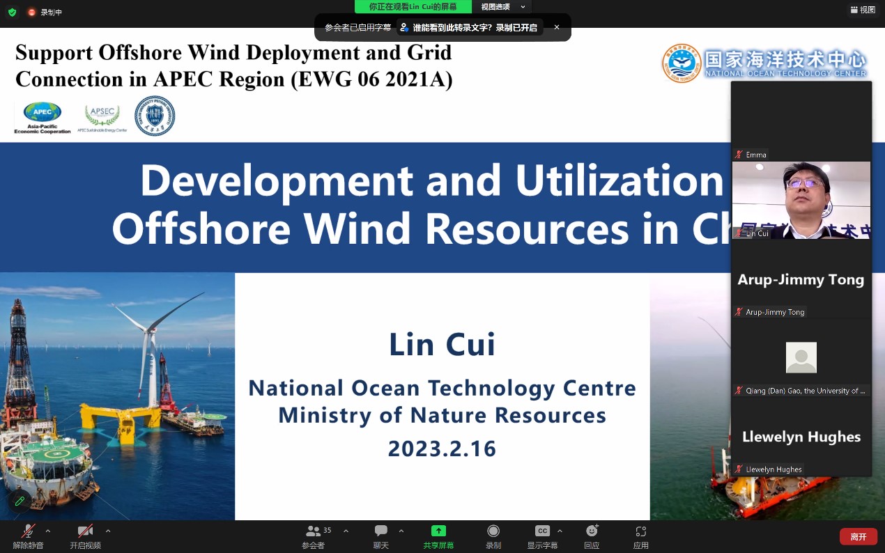 2023年2月15日和16日上午,天津大學APEC可持續能源中心(APSEC)以線上會議的形式舉辦了“支持APEC區域海上風電部署和并網”國際研討會。此次研討會是天津大學承擔的APEC基金項目(EWG-06-2021A)系列活動的一部分,會議邀請了來自國際可再生能源署(IRENA)和世界海上風電論壇(WFO)等國際性的可再生能源與海上風電機構,以及美國Marathon Capital、越南CTE Wind公司、韓國風能產業協會、日本海上技術安全研究所、澳大利亞國立大學、英國ARUP工程顧問公司等十余家國內外專業技術協會、金融機構、能源和電網企業的報告人,分享全球海上風電發展的最新動態,交流APEC地區的海上風電技術與開發經驗,為APEC區域的海上風電發展搭建交流與合作平臺。