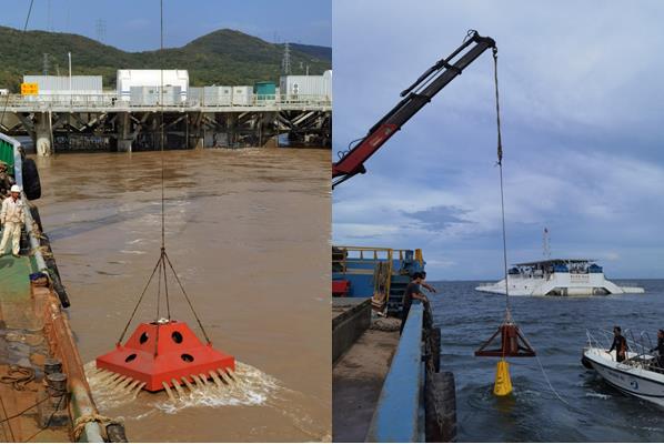 圖 潮流能發(fā)電裝置(左)和波浪能發(fā)電裝置(右)現(xiàn)場(chǎng)測(cè)試
