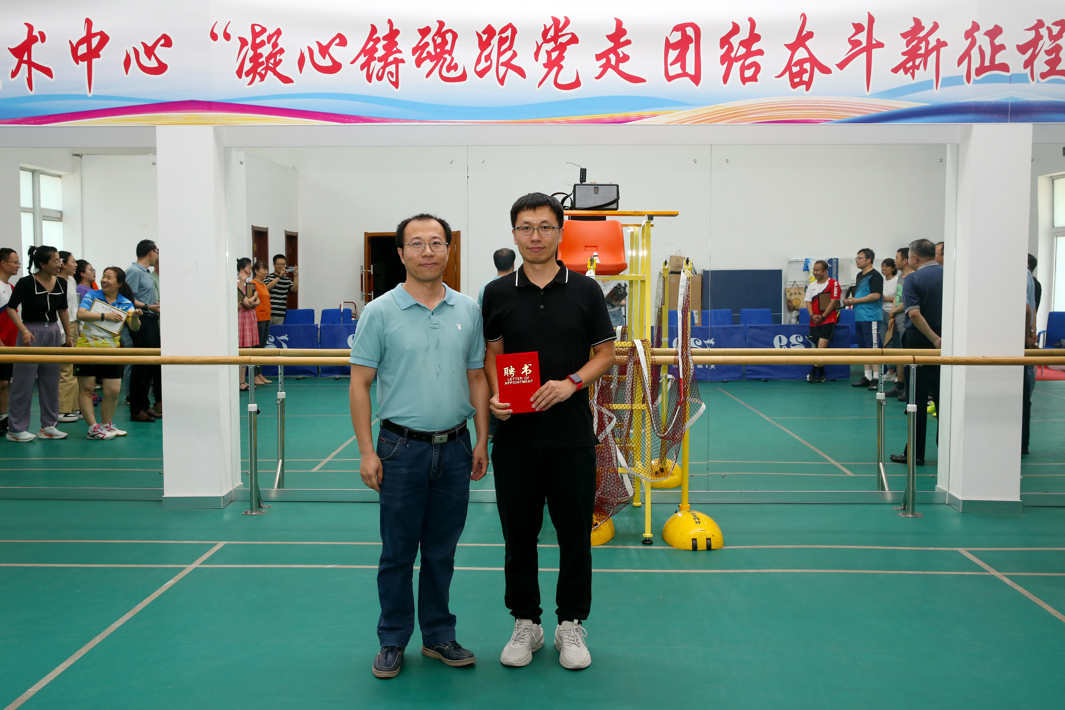 本次賽事的成功舉辦還得益于兄弟單位國家海洋標準計量中心大力協助,提供場地和裁判員為比賽順利進行保駕護航,中心黨辦主任鄧云向裁判員頒發了聘書并向計量中心羽毛球隊贈送了比賽用球以表達謝意,進一步增強了兩個中心的互動交流。(羽毛球興趣小組、工會)