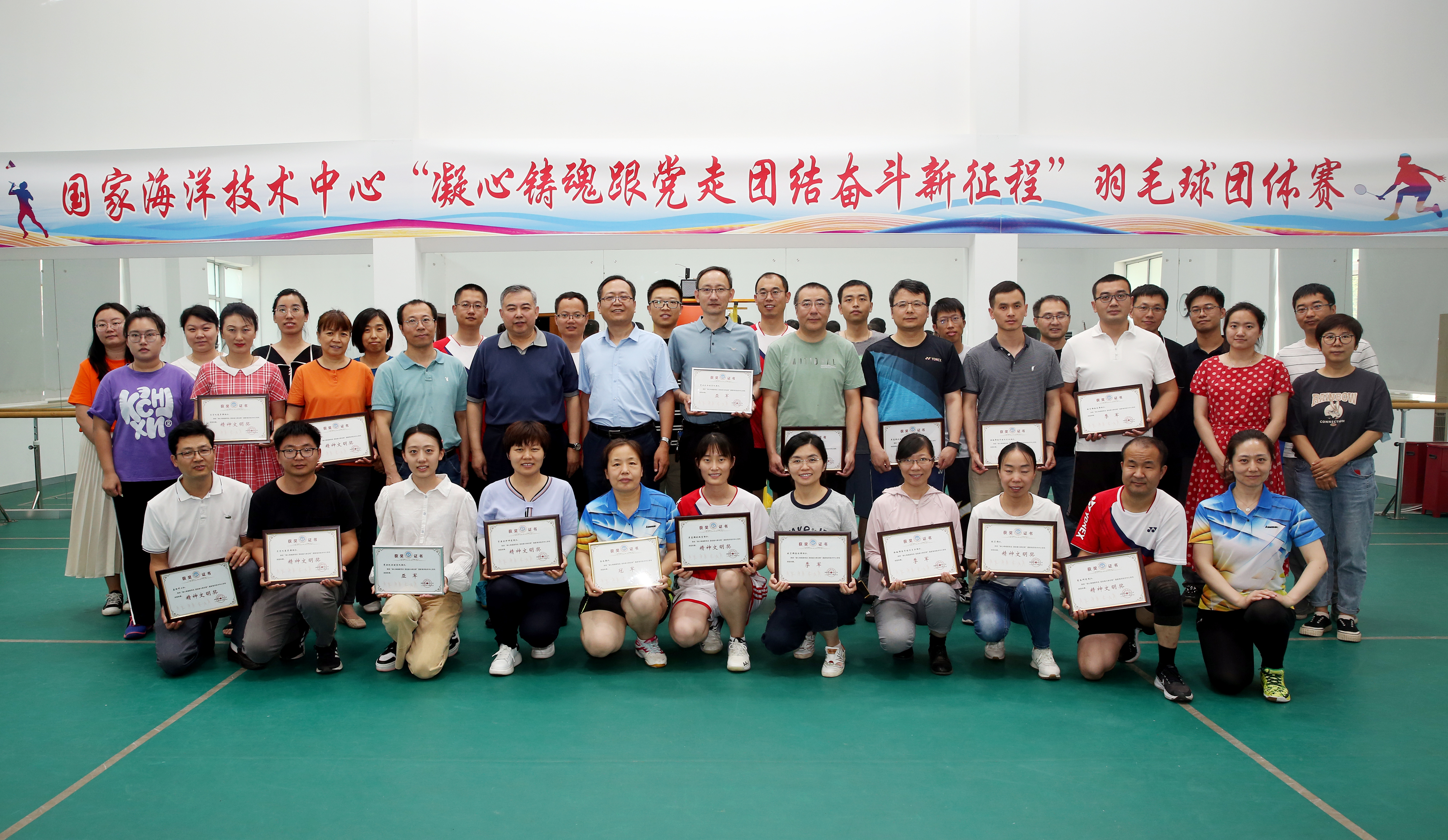 6月16日,國家海洋技術中心“凝心鑄魂跟黨走 團結奮斗新征程”羽毛球團體賽頒獎儀式在國家海洋標準計量中心球館舉行。中心副主任隋軍、紀委書記王世福到場為獲獎參賽隊頒獎,并為隨后開始的表演賽開球。表演賽由中心羽毛球隊拆分為紅藍兩隊,模擬蘇迪曼杯賽制展開對抗,比賽精彩紛呈、扣人心弦,展示了羽毛球隊的訓練成果,也為為期一周的團體賽畫上了圓滿的句號。