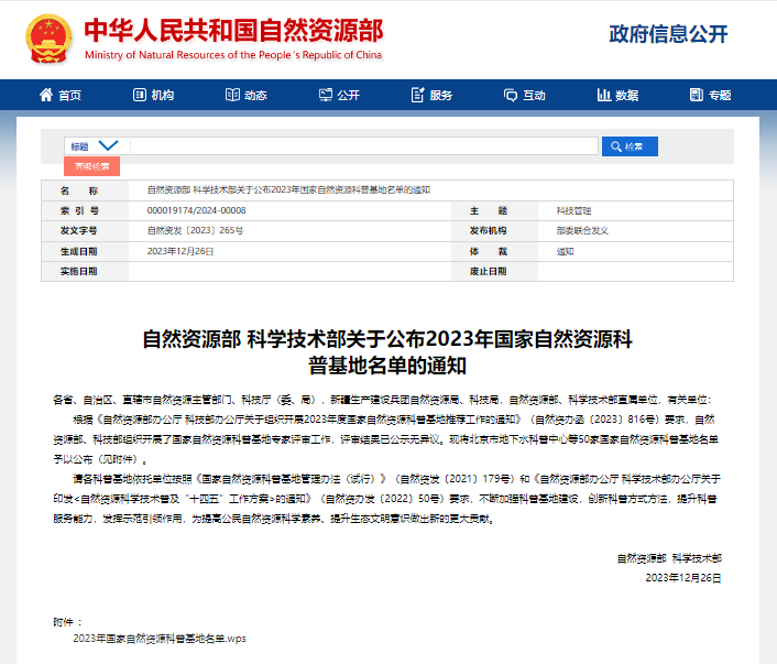 國家自然資源科普基地是由自然資源部和科技部共同審定的科普基地,是踐行習近平生態文明思想,展示自然資源科技成果,普及地球科學知識,傳播生態文明理念,提高全民自然資源科學文化素質的重要場所,是國家特色科普基地的重要組成。