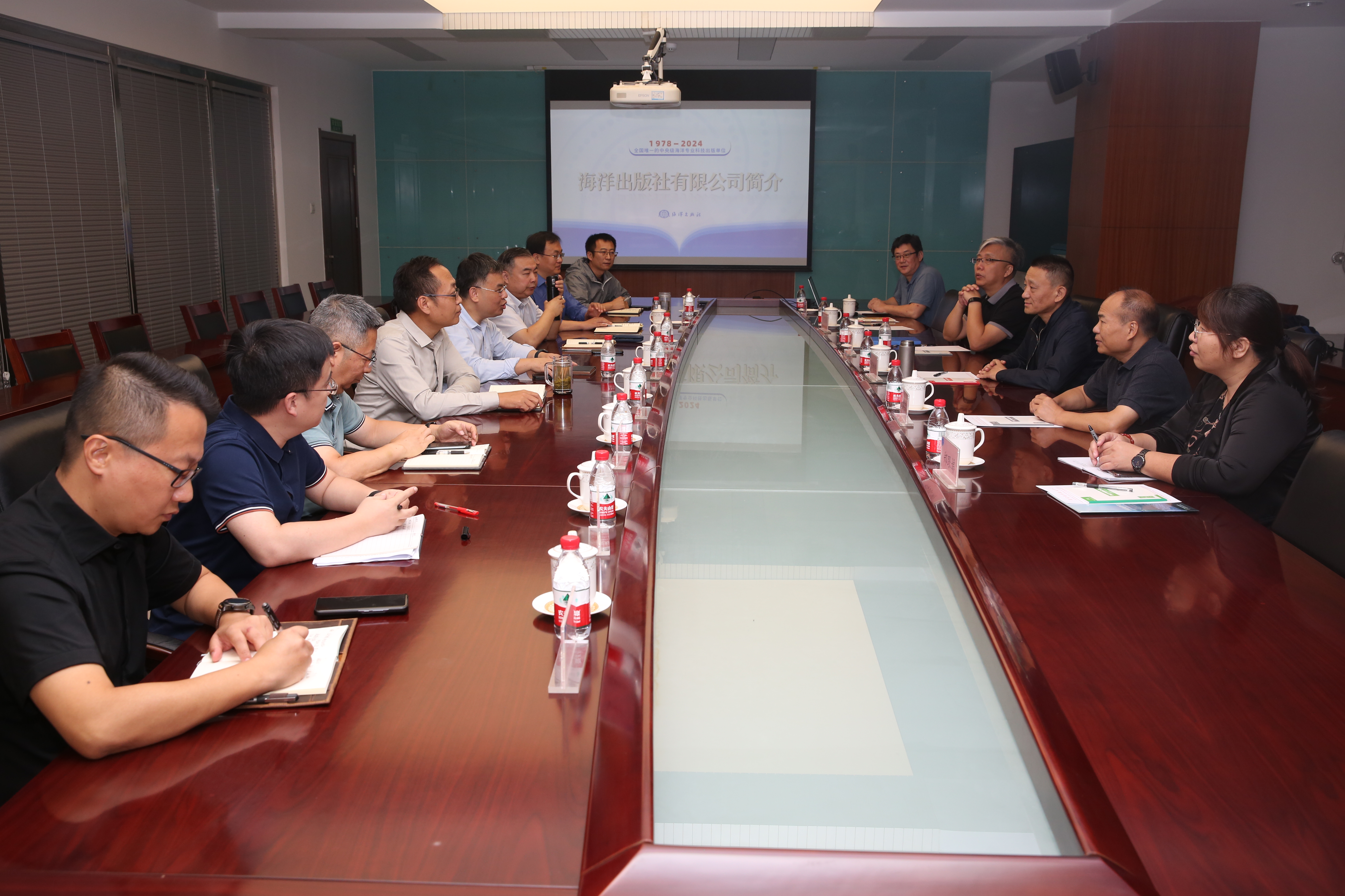 2024年9月23日,海洋出版社有限公司黨委書記、董事長郭利偉,總經理石忠獻,副總經理唐建軍及有關部門負責人到中心調研交流。中心主任、黨委書記彭偉,副主任隋軍,紀委書記王世福及有關部門負責人參加座談交流。雙方就進一步強化合作進行了深入交流探討并達成共識。